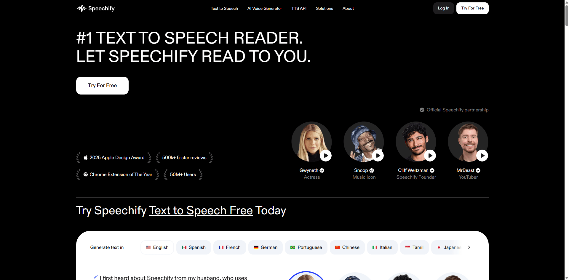 Speechify | $29/month | Limited | 50+ | 30+ | Accessibility | ⭐⭐⭐⭐ |